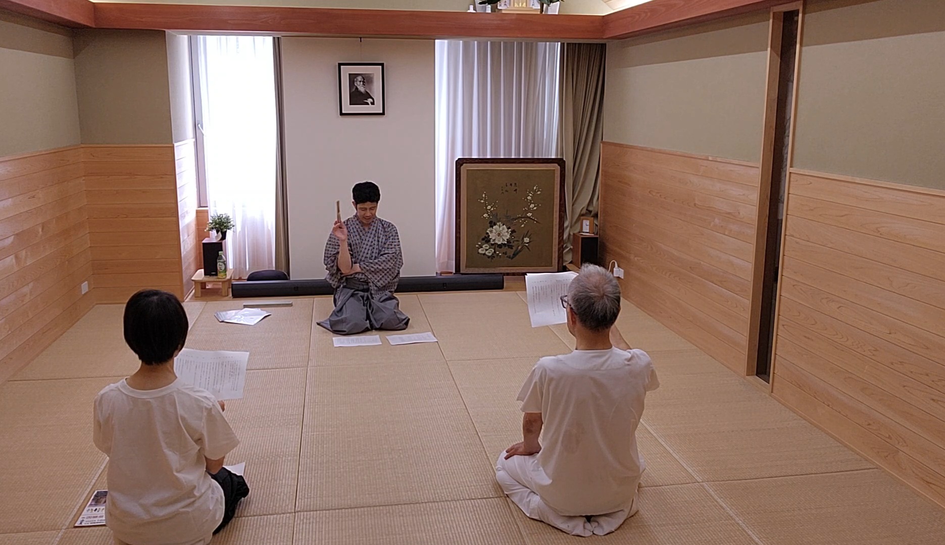 6月27日金曜は10時から第一回目の狂言のお稽古会を行いました。講師は大蔵流 茂山 千五郎家 能楽師 狂言方 井口竜也さん。合気道同門の山本さんと参加しました。
